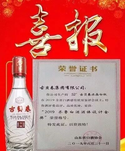 古贝春52度水晶白版荣获“2019齐鲁白酒酒体设计金奖”称号