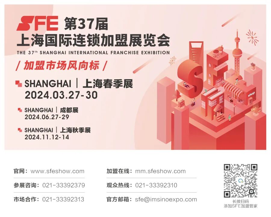 [温馨提示] 文章来源于SFE上海国际连锁加盟展览会,转载注明原文出处,此文观点与查生意无关,理性阅读,版权属于原作者若无意侵犯媒体或个人知识产权,请联系我们,本站将在第一时间删掉 ,查生意仅提供信息存储空间服务。