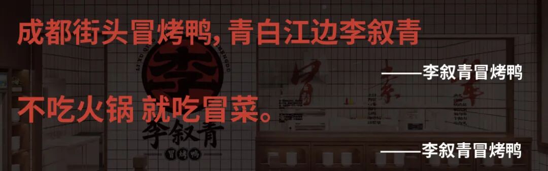 说起成都冒菜,冒烤鸭是每个成都人心里最有代表性的“家”的味道,在成都人的心里“ 不吃火锅,就吃冒菜”,而吃冒菜一定会吃成都街头的冒烤鸭。创始人李叙青是一位在成都 街头做摊摊冒烤鸭的寻常女性。她的小摊位于成都市青白江区鸭子河的岸边,李叙青从年 轻时就开始用最新鲜的鸭子在炉里现烤等到食客准备食用时,新鲜现冒。李叙青冒烤鸭一 冒就是几十年,没有固定的店铺只有一个小推车,却让众多成都食客流连忘返。成都冒菜的灵魂就在于一只冒烤鸭,李叙青冒烤鸭,成都冒菜扛把子。