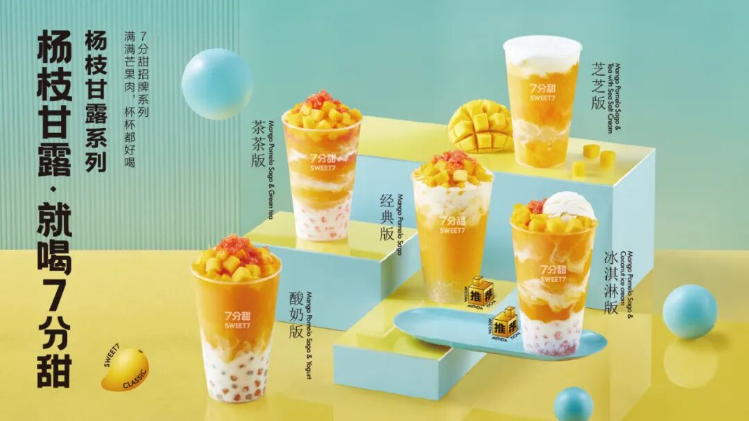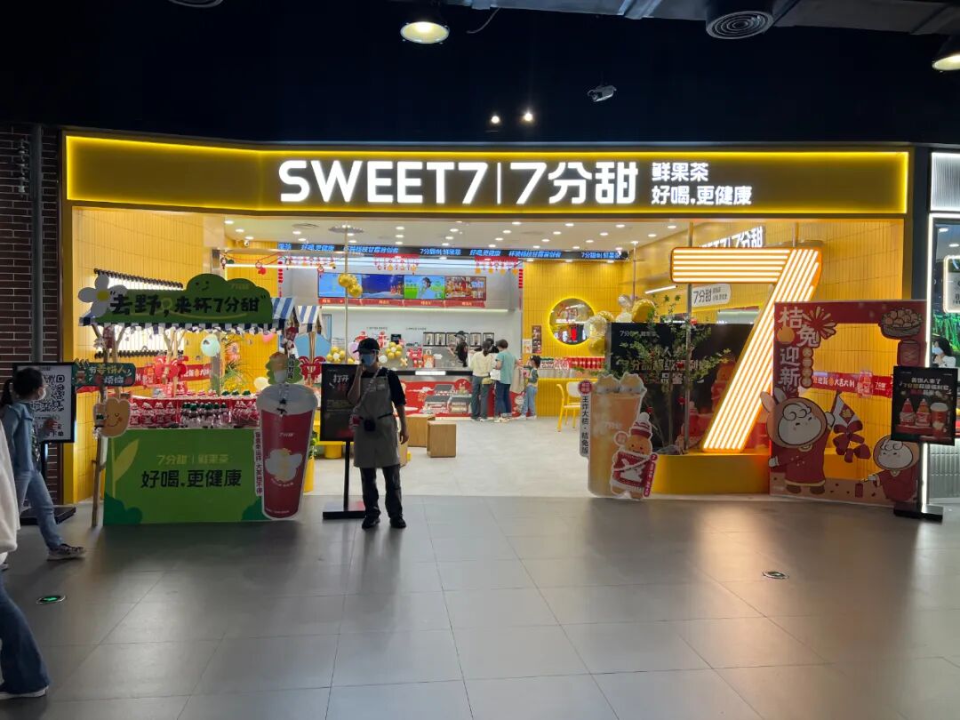 2015年,谢记甜品正式升级为7分甜,并开放加盟合作进行规模化发展。2022年,7分甜在杯装杨枝甘露上市15周年之际,升级了品牌定位,正式定义其品类为“鲜果茶”,在“好喝”基础上更强调“健康”,同时两次刷新了营业额纪录。