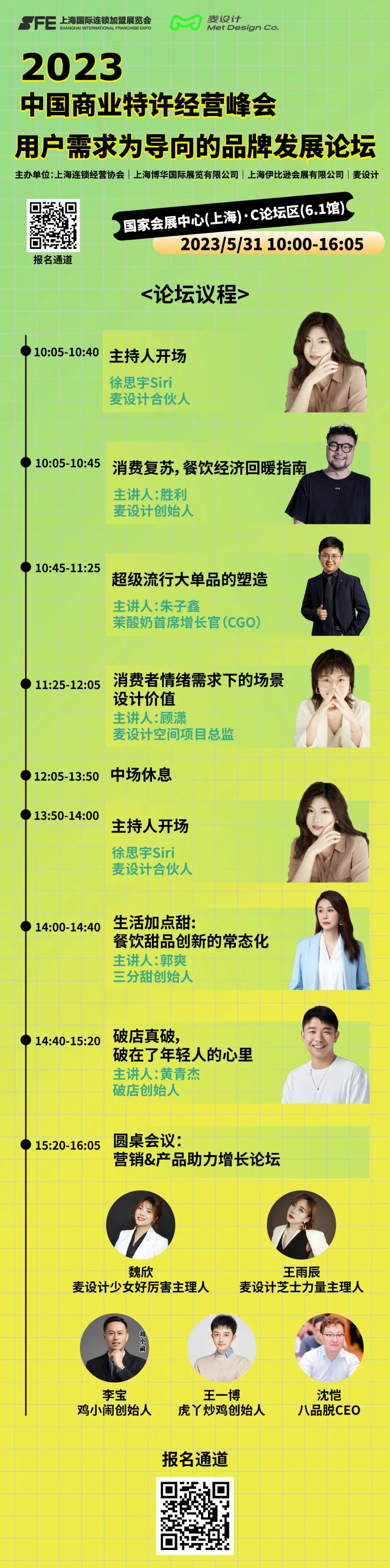 2023中国商业特许经营峰会——用户需求为导向的品牌发展论坛由上海连锁经营协会、上海博华国际展览有限公司、上海伊比逊会展有限公司、麦设计联合主办。随着人们生活质量的提高以及餐饮行业的发展,新的市场需求和消费趋势也逐渐涌现。为此,我们将举办一场围绕餐饮理解新需求、做深好品牌的主题论坛,致力于为餐饮从业者和餐饮爱好者创造一个互动交流的平台。论坛将聚焦餐饮行业的热点话题,从消费需求、品牌建设、创新营销等多个角度来解读餐饮行业的新动向,探讨如何做好品牌、提升服务质量,以及如何更好地满足消费者的需求。我们还邀请了多位业内专家和知名从业者,分享他们的经验和见解,为参会者提供全方位、深度的交流和学习机会。无论您是一名创业者、一名从业者,或者是对餐饮行业有浓厚兴趣的消费者,都欢迎您参加我们的主题论坛,一起为餐饮行业的发展献智献策!