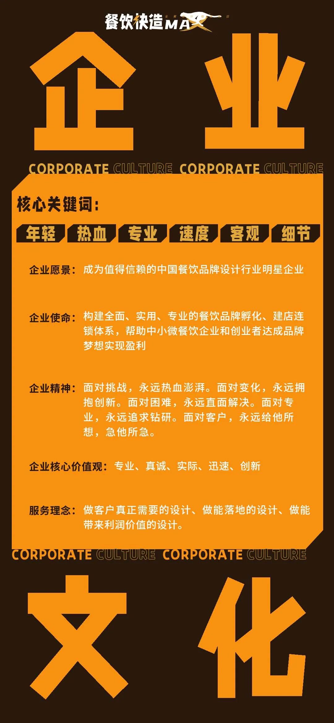 餐饮快造品牌设计,专注餐饮品牌全案设计、建店、营销落地服务。以“六维动力品牌设计方法论”助力餐饮品牌孵化、建店、连锁化进程,比之强调品牌前期孵化过程的品牌设计单位,餐饮快造在文化及视觉设计后,更关注品牌的阵地建设及战斗模式,即:品牌店铺快速落成、品牌营销发声快速出击。快速孵化、快速建店、快速连锁 ——餐饮快造,快速创造餐饮品牌,从无到有,一气呵成!
