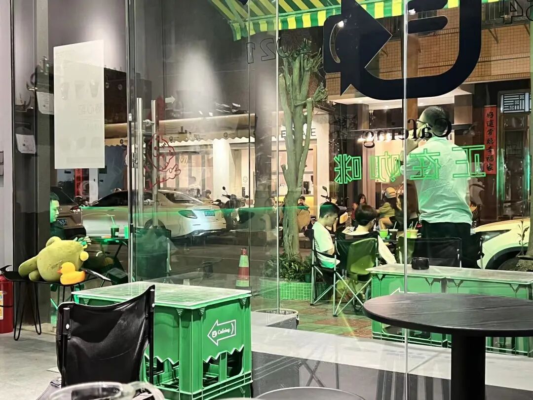 晚上的顾客,基本上都坐在店外喝咖啡,年轻人们聊天、玩游戏,咖啡像是一杯“手边饮品”,随意又自在。