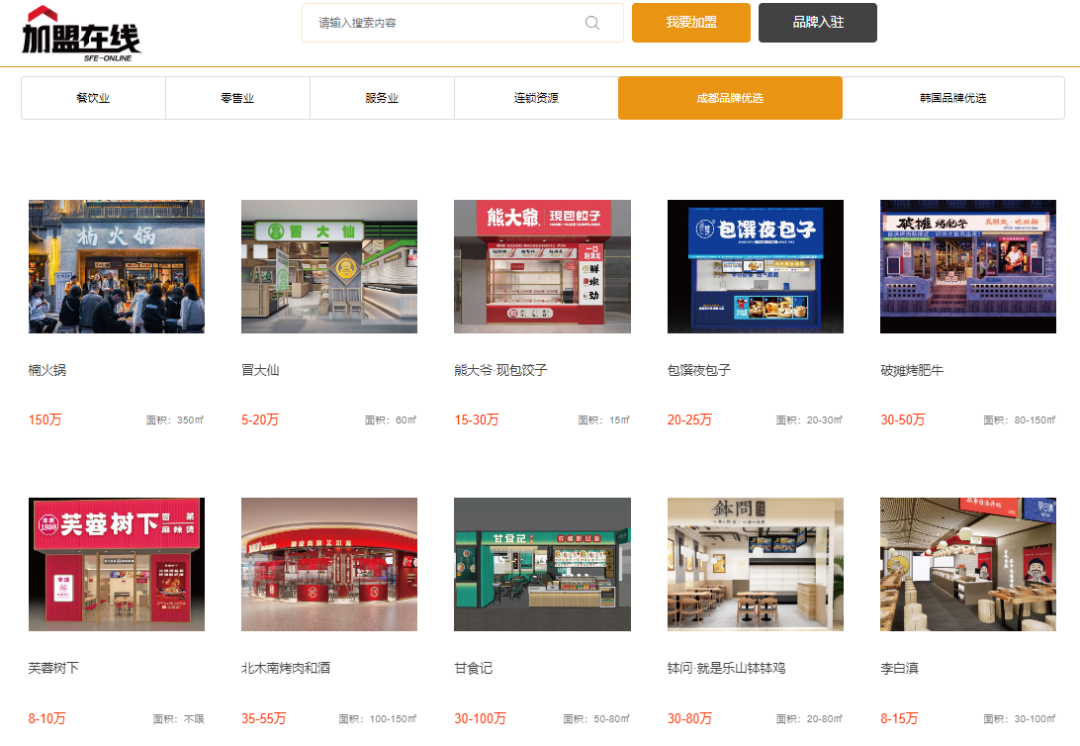 作为美食之都的成都,其餐饮市场对全国范围内都拥有着强大的影响力。在这三年里,成都的餐饮市场发展如何?成都的餐饮品牌又是如何应对不确定性的一轮轮冲击?在这其中,涌现了哪些表现尤为亮眼的连锁加盟品牌?近期,SFE加盟在线平台上线了成都品牌优选专栏,汇聚楠火锅、冒大仙、熊大爷现包饺子、包馔夜包子、破摊烤肥牛、芙蓉树下、甘食记、北木南烤肉和酒及李白滇等川渝地区知名的餐饮连锁加盟品牌,集中展示他们的品牌特色、产品及店型优势、投资额度和加盟商务政策等。更多详情,可扫描下方二维码或登录网站:https://mm.sfeshow.com,按照指示流程注册会员后,即可询盘心仪项目。更有1200+优质连锁加盟品牌,以及专属客服为您提供与意向品牌的加盟配对对接服务。赶快登录体验吧。