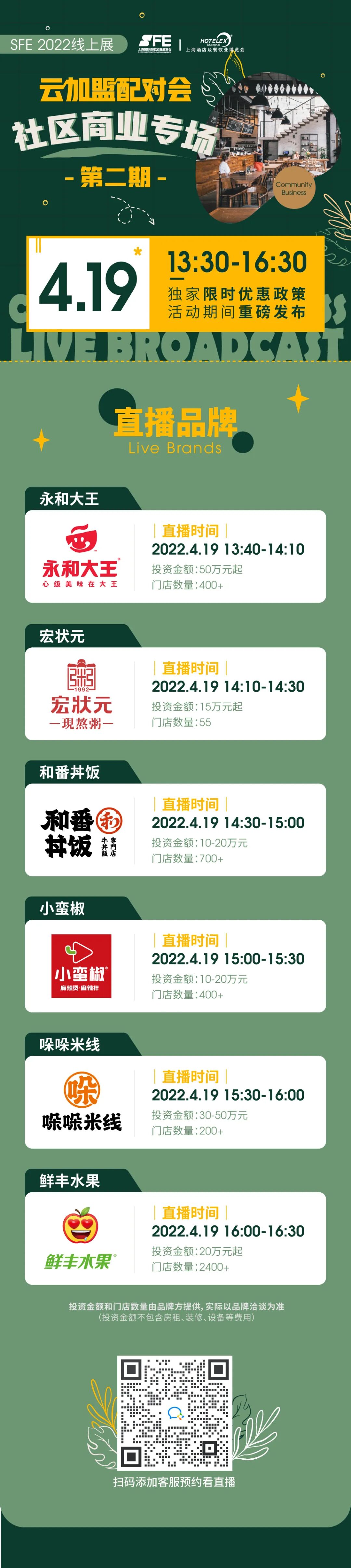 2022年4月19日13:30,SFE云加盟配对会社区商业专场火热来袭!我们邀请到永和大王、宏状元、和番丼饭、小蛮椒、哚哚米线、鲜丰水果等多家社区商业细分赛道头部品牌和新锐品牌,深入探讨社区商业的广阔前景和投资机遇。扫码锁定直播现场,享受专属定制、超高性价比商务合作政策!