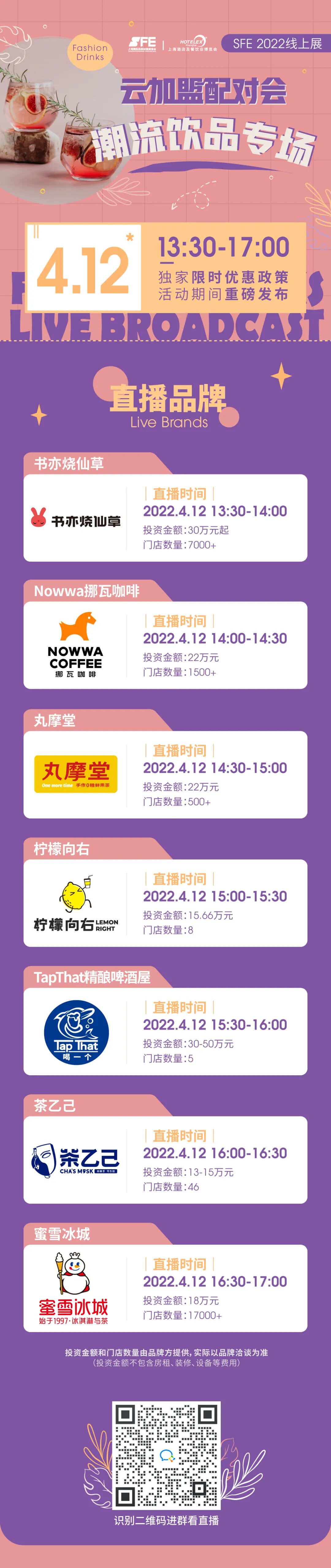 4月12日13点30分,我们将迎来SFE云加盟配对会潮流饮品专场,包括书亦烧仙草、Nowwa挪瓦咖啡、丸摩堂、柠檬向右、TapThat精酿啤酒屋、茶乙己、蜜雪冰城等7家涵盖新中式茶饮、咖啡、柠檬茶和小酒馆等主流细分赛道的知名标杆品牌和实力新锐品牌,邀您共探潮流饮品赛道的加盟投资新机遇。更有专属优惠商务政策,扫码报名锁定直播现场揭晓。