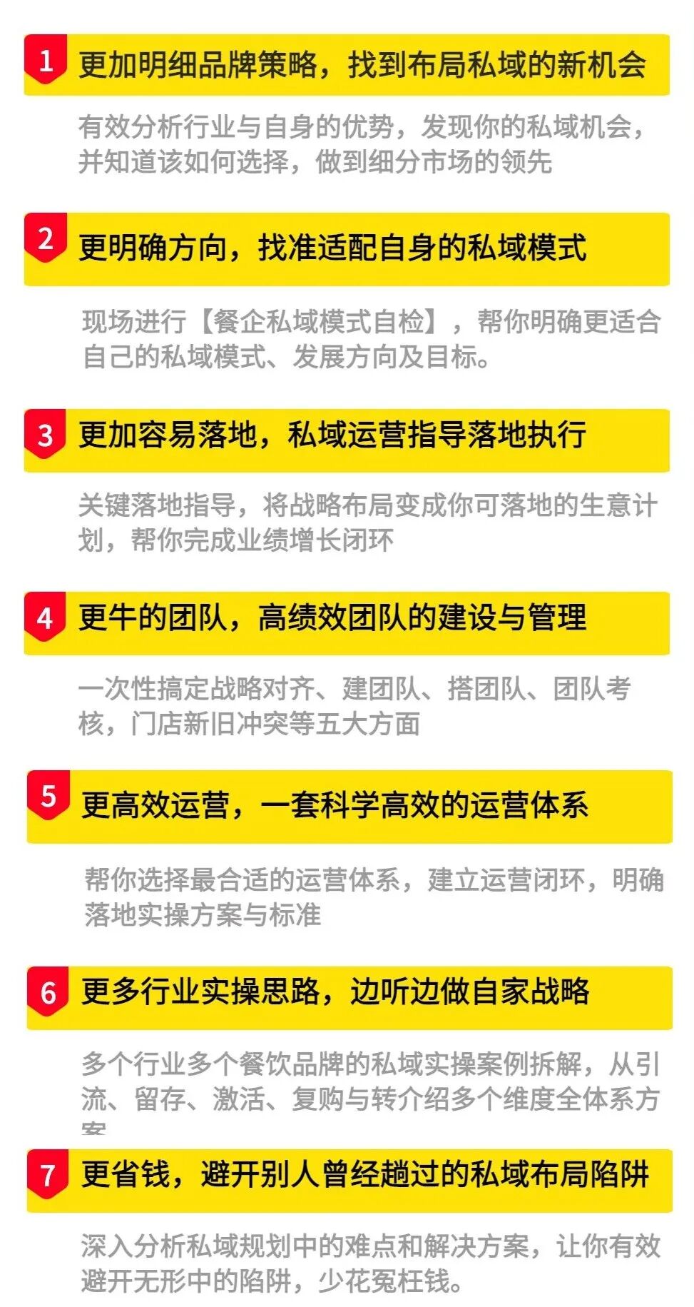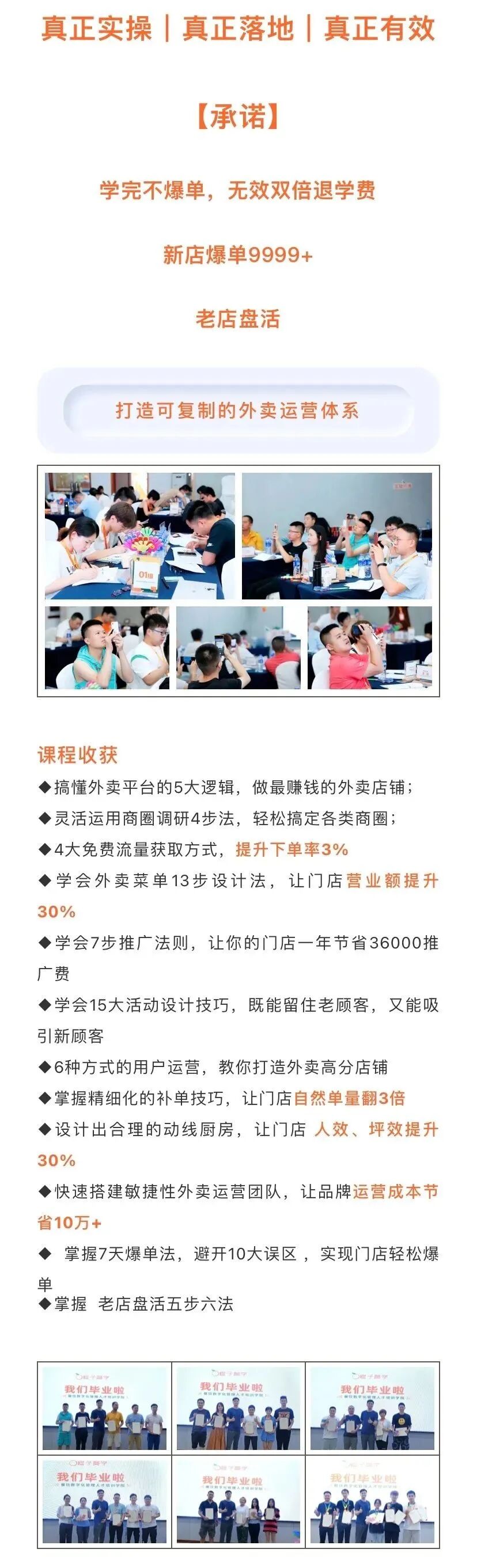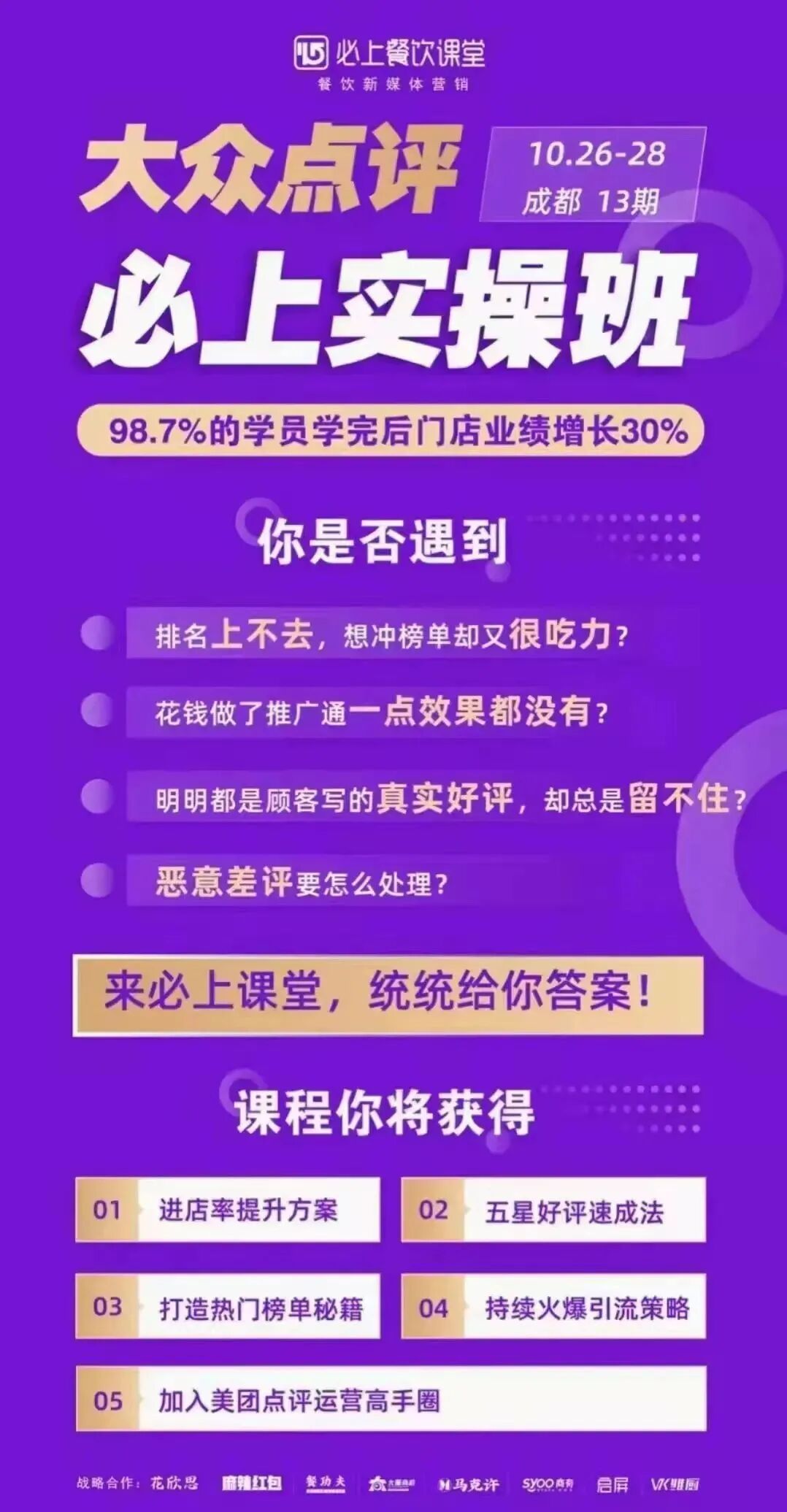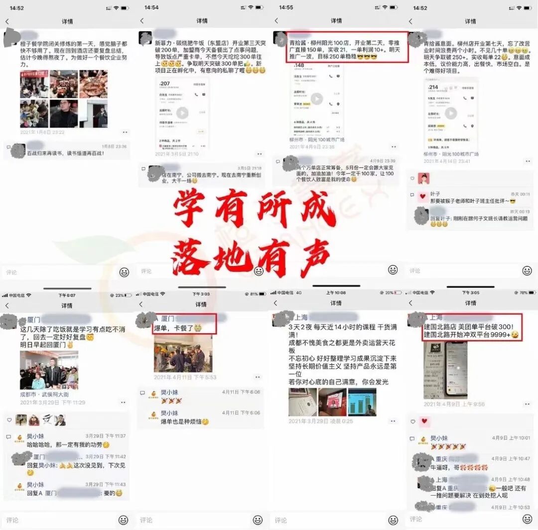 ▲部分学员品牌外卖不仅是餐饮品牌的线上新渠道,更是餐饮数字化的第一步。能否通过数字化的手段提升经营效率,当供给大于需求时能否找到新的突破口,解决这些难题是外卖平台的新方向,而且通过线上平台的运营,可以精准的找到客群,收集到用户的消费习惯数据。数字化时代最重要的是什么?是数据!通过数据分析,让我们从商圈到选品,不再盲目做生意!去年的一场疫情后,市场上所有的头部品牌都在做私域体系,但是私域流量体系到底是什么?作为单店老板的你应该如何运作?作为拥有多个门店的你又该如何去调动安排相关人员?作为一个区域性品牌及跨区域品牌的你,该怎么去搭建运营体系和管理团队?公域流量获客成本日渐高涨的当下,私域流量是企业必须费心思做的地方,而且私域流量所收集到的数据,也是利于企业更加了解客户的喜好,能更精准的推荐相应产品,增加客户复购的频率,提高企业效益。在流量越来越贵的时代,如何通过大众点评增加入店率?如何成为大众点评热门店铺?红利见底的时代,餐饮品牌如何做到流量突围?大众点评运营实操班帮你解决难题,从运营到排名,从火爆到持续引流,再到如何获得五星好评,全实操干货!