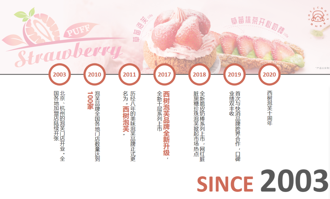 西树泡芙:源自于法语Chez Choux,意为“泡芙之家”。2010年成立至今,已拥有超过500家门店,始终致力于为大众提供幸福美味的甜品。