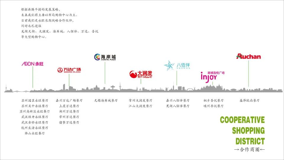 根据犇腾牛排的发展策略,未来我们将主要以布局购物中心为主。目前我们是永旺长期战略合作伙伴,同时也已进驻龙湖天街、大润发、海岸城、八佰伴、万达、吾悦等大型购物中心。