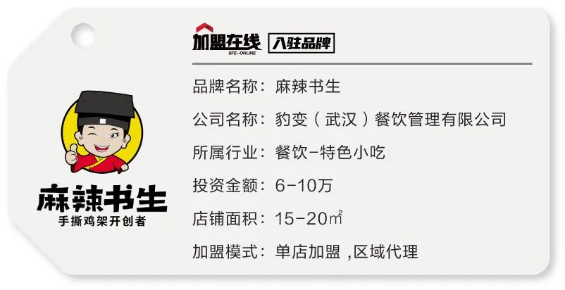 豹变(武汉)餐饮管理有限公司,根植于中国14万亿巨大餐饮市场空间,中国品牌餐饮全产业孵化平台,专注为餐饮人赋能,作为新一代品牌餐饮孵化平台,豹变为创业者输出从投融资、产品开发、商业模式、品牌定位、精准营销、营运管理、数据管理、供应链等一系列完整商业驱动价值体系。 公司旗下品牌众多,本次参展品牌“麻辣书生”是豹变餐投旗下的休闲小吃品牌,作为手撕鸡架开创者,我们遵循“以食客体验为先”的产品理念,精选优质新鲜生态鸡,24重烹制工艺流程,先“卤”、后“熏”、再“炸”,健康食材,较真工序,匠心调制,坚持最初的好味道。武汉首店上线30天爆红光谷商业圈,荣登外卖炸鸡品类销量冠军。我们努力做好,成为全国炸鸡行业NO.1