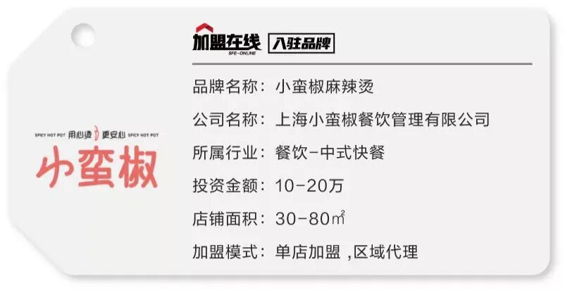 小蛮椒麻辣烫,隶属于上海小蛮椒餐饮管理有限公司,品牌成立于2015年6月,总部位于上海市徐汇区。品牌开创以来深受消费者喜爱,于2019年4月正式开放全国加盟,目前已拓展40个城市,150+门店。 品牌在五年发展历程中,以“成为受人尊敬的世界级餐饮品牌”为愿景,“让顾客吃到安心,感到幸福”为使命,“消费者为立身之本,真诚、担当、协作、奋斗、阳光、乐观”为价值观。建立线上线下联动的多渠道发展模式,搭建连锁运营标准化体系,构建即盈利且易复制的店面运营系统,为每位加盟商带来整体输出,和高效、安心的服务保障