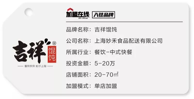 吉祥特色馄饨是秉承千年中国饮食文化传统--吉利祥瑞的馄饨与吉祥人的聪明果敢、勇于创新突破、追求品质的精益求精精神融汇而成,创造了“皮嫩、个大、馅多、味美”的新式特色馄饨,盛行上海、风靡大江南北、香飘京城,名扬海内外。