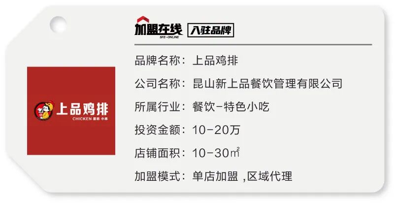 昆山新上品餐饮管理有限公司创立于2013年,是一家从事于休闲小吃连锁店投资、开发和运营管理的专业化餐饮企业,目前已经发展成为集产业研发、物流配送、连锁销售和运营管理于一体的综合性餐饮服务商。 公司先后开发出鸡排、酸辣粉、肉串、鱿鱼、台湾烤肠、饮品、汉堡等七大类、数十个畅销产品,2018年末公司斥资数百万元成功收购巴弟鸡排,初步形成上品鸡排、巴弟鸡排、面筋公子、金粉佳煮、梦茶五大品牌共同发展的格局。 在历经重重苦难和市场的严峻考验下,上品鸡排终有所成,旗下连锁门店突破1000家,形成以华东为核心,华南、华北、华中、西北、西南共同发展的良好势头。秉承“用心做好每一份上品美食” 的企业宗旨,上品公司将继续把为客户提供的健康美食食品、为企业员工创造有利价值、为合作伙伴创造更大的利润空间作为使命,倾力打造国内潮流餐饮品牌,努力成为一家有价值的餐饮连锁企业。