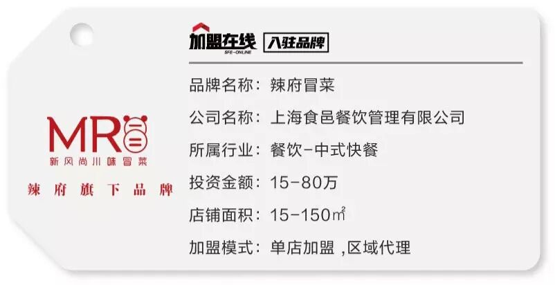 上海食邑餐饮管理有限公司成立于2017年,是一家具有专业的产品、研发、销售、培训、原物料设备器具销售服务的公司。 辣府MR冒菜:门店采用自选模式,通过线上和线下销售渠道达到盈利。辣府冒菜实行全国连锁餐饮经营,专门配置专业的全体系运营团队,协助统一形象,同一口味与技术标准,统一菜单,统一配送,旨在打造中国正宗川味冒菜第一连锁品牌。