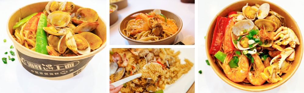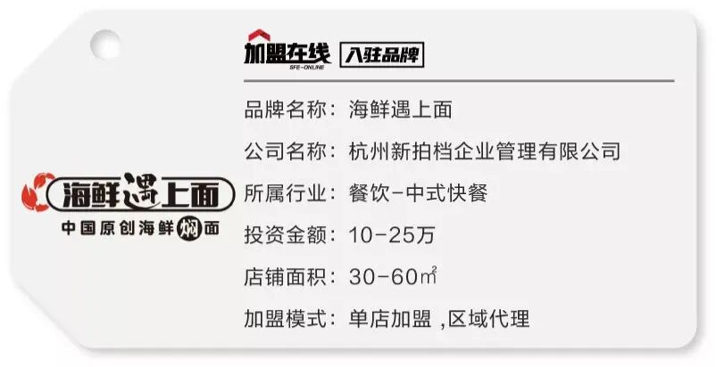 “海鲜遇上面”是新拍档餐饮于2017年新创立的一个大单品海鲜焖面品牌。丰富主食搭配多种海鲜,让食客花上二三十元就能品尝到三五种海鲜。 “海鲜遇上面”主打舒适的环境,高端的食材,低端的消费,给用户带来法式铁板烧的高级就餐体验。 截止2019年3月,“海鲜遇上面”全国门店已达2000多家。