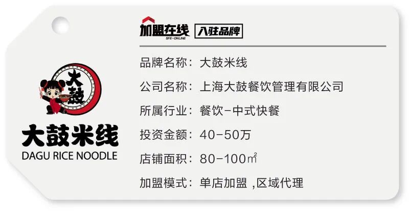 大鼓米线”是由上海大鼓餐饮管理有限公司投资创立的,面向全球打造的一个餐饮品牌,是专业的餐饮合作服务商。上海大鼓餐饮管理有限公司成立于2010年,总部位于上海,主要经营米线系列产品和地方特色小吃。 在米线行业内率先导入CIS形象识别系统,贯彻HACCP安全卫生系统。以弘扬中华美食文化与推动中国快餐为使命。