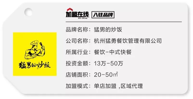 杭州猛勇餐饮管理有限公司,旗下现有【猛男的炒饭】品牌。猛男的炒饭秉承传统,坚持铁锅高温爆炒工艺、人工大火颠锅,力求为顾客提供“正常炒出来的好炒饭!”。猛男的炒饭自2015年11月第一家门店营业,截止到2019年4月,猛男的炒饭已拥超过260家门店,店面遍布国内23省,把一份炒饭卖破亿,成为细分的炒饭品类领跑者,当之无愧成为杭州乃至全国的炒饭品牌之翘楚。猛男的炒饭开创了炒饭品类品牌化运作的新时代,领跑炒饭品类,并将持续努力成为“中国高品质炒饭创导者”。