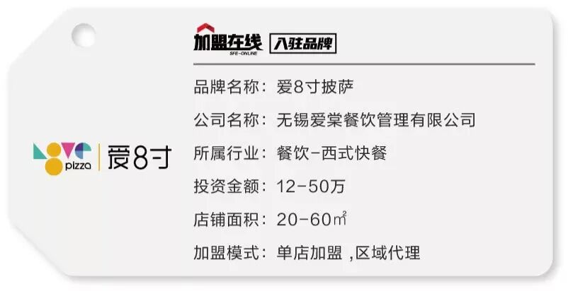 爱8寸披萨成立于2012年,公司本着“致力于让顾客享受最安全、健康、丰富的特色美食,享受爱的味道’’的经营理念,不断提高和完善管理水平,提高企业素质,注重食品安全,保证产品品质,做食品良心企业。 爱8寸披萨颠覆传统西餐市场上意式披萨的领导地位,拥有多种口味披萨,爱八寸招牌、法兰克福牛排披萨、超级自尊皮萨、等众多系列美食,口感纯正,众口可调。打造“专属于国人的披萨” 。