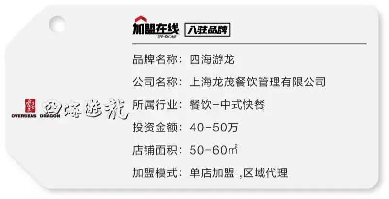 四海游龙于1993年在台北创立,被誉为全台湾最老字号的锅贴连锁店。 2003年,四海游龙在上海设立上海龙茂餐饮管理有限公司和众爱食品(上海)有限公司,跨出了在中国蓬勃发展的第一步。 2005年,四海游龙在上海嘉定建立了中央厨房 ,拥有自己专业独立的冷链配送系统,为品牌的壮大起到了保驾护航的作用。 时至今日,四海游龙已有27个年头,在上海、苏州、香港、台湾等地拥有过百间餐厅,并大力拓展加盟系统,欢迎社会各界精英人士加盟拓店!