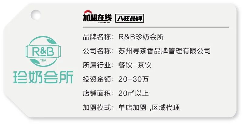 苏州寻茶香品牌管理有限公司旗下品牌 R&B珍奶,延承R&B14年上等国际茶叶原料,坚持品质与服务至上,始终致力于打造茶饮界的APPLE,数百次严苛的配比研发、每季的新品上市,换来数百万人次的用户体验,已成为年轻人健康茶饮的首选品牌。并经由31个省市的调研论证及拥有完善的加盟流程,即从总部考察参观到铺位审核、签订合同,配套的店铺设计、营销推广、支援开业,外卖运营全程严选加盟合作伙伴,共同为更多的顾客提供安心及最新鲜的口感保证--找真味喝珍奶,最大化的呈现健康与美味的完美融合。