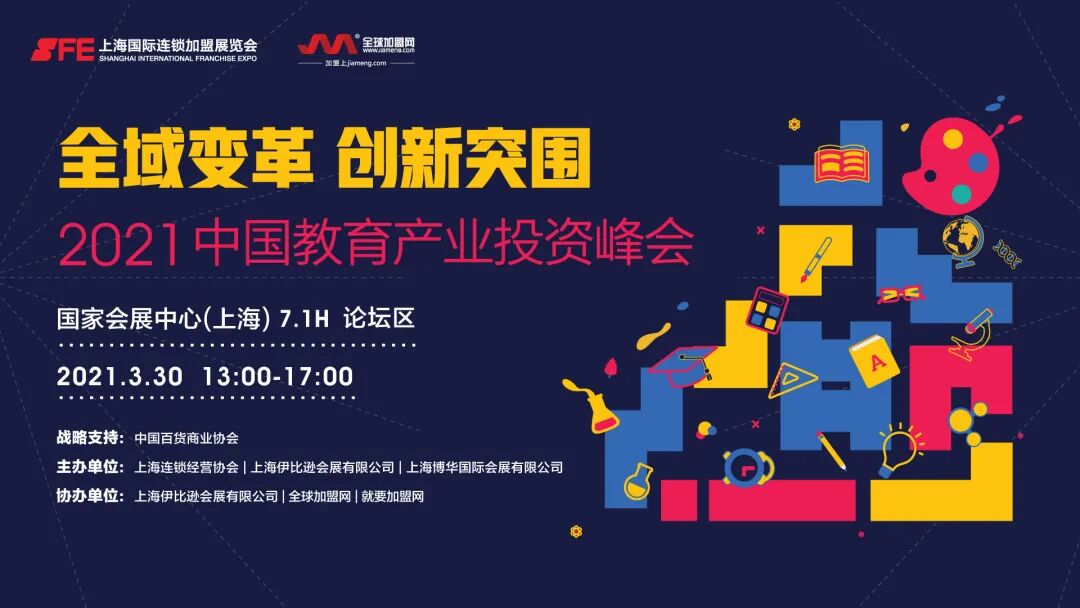 展会还将同期举办《“全域变革 创新突围”2021中国教育产业投资峰会》,围绕教育行业新品类,新模式,新组织,新渠道,新服务五个纬度,邀请众多知名教育专家学者和行业品牌大咖从不同维度出发,共同探讨未来教育产业发展趋势,探索教育创新的机会与可能,积极推动中国教育行业的持续创新与蓬勃发展。