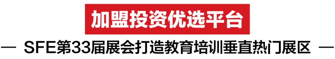 SFE教育培训板块经过多年深耕,始终紧贴市场脉搏,吸引了众多品牌和投资人的持续关注和热情参与,规模也不断扩大,其中不少加盟配对意向已经陆续得以兑现,成为规模度与专业度并重的国内教育培训加盟投资优选平台。SFE第33届展会现场,我们策划了青少年培训这一热门展区,邀请市场主流标杆品牌和实力新锐品牌,业态涵盖启蒙教育、早教中心、少儿艺术培训、幼/小学托管班、语言培训及课外辅导等细分业态,为有志于加入教育培训行业的投资人群,提供了解行业热点及风向趋势,配对优质教育培训加盟项目的绝佳平台。