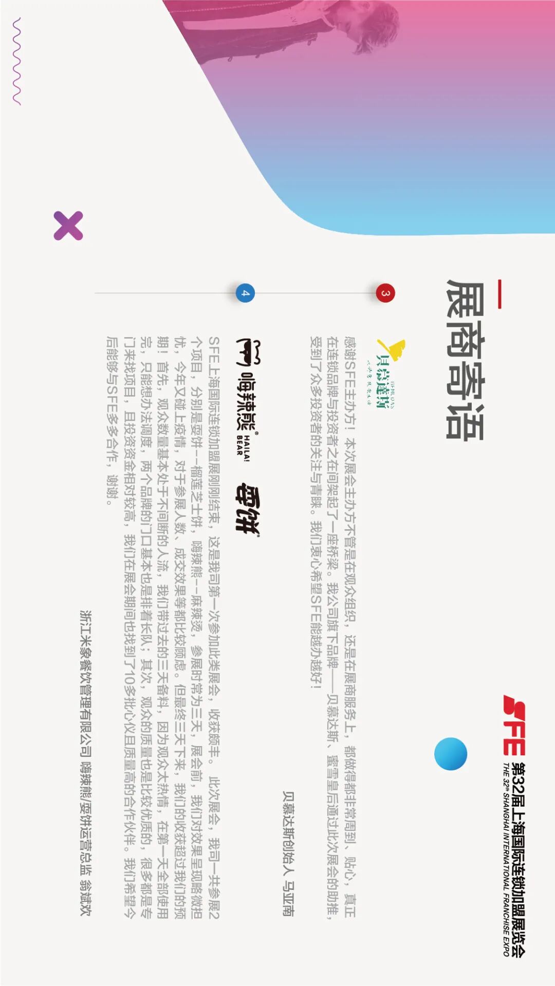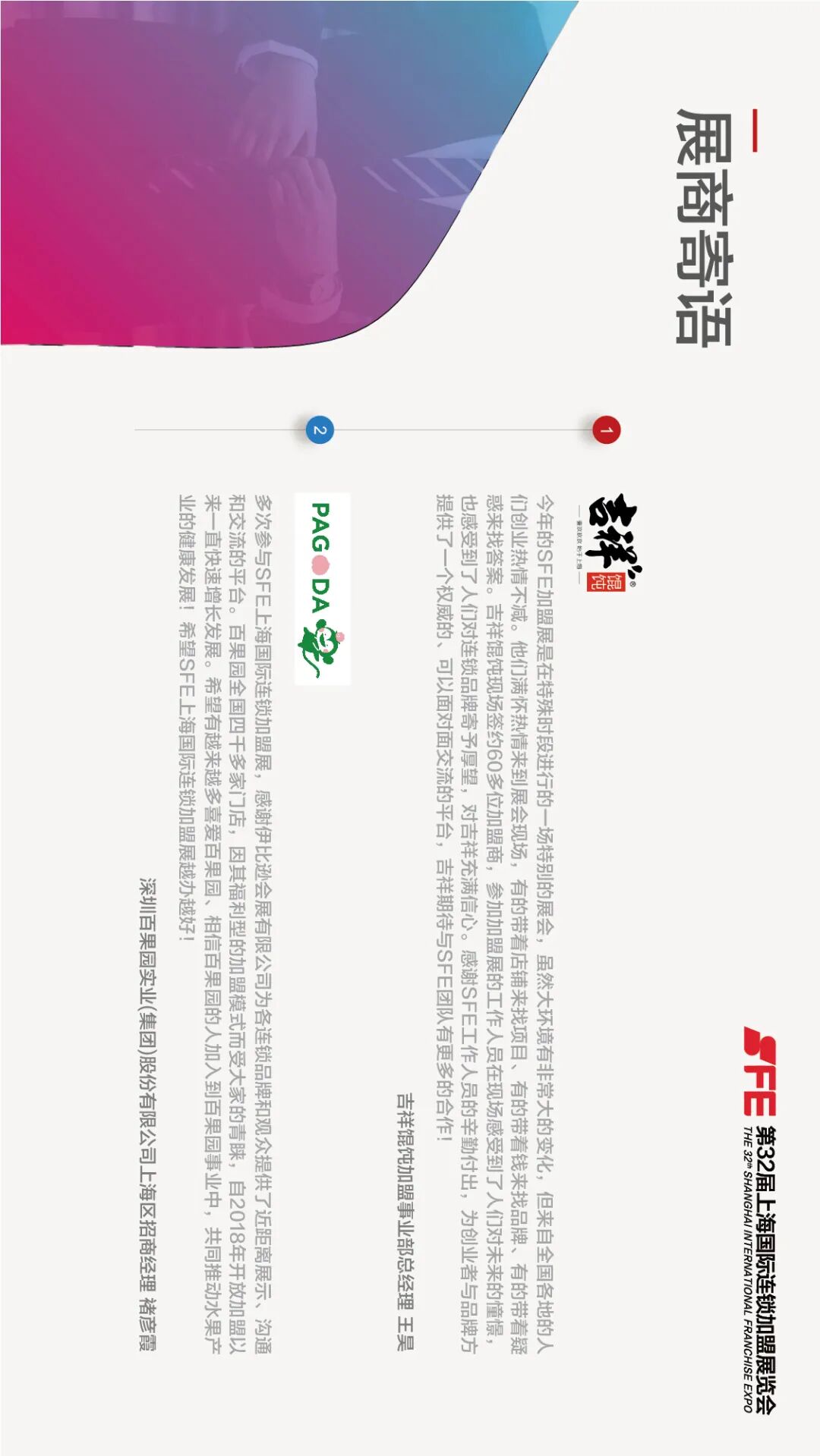 吉祥馄饨加盟事业部总经理王昊表示,本届SFE展会在特殊时段里,为创业者与品牌方提供了一个权威的、可以面对面交流的平台。吉祥馄饨现场签约60多位加盟商,参加加盟展的工作人员在现场感受到了投资人群对未来的憧憬。感谢SFE工作人员的辛勤付出,明年SFE第33届展会,我们将进一步提升展会现场的体验感,期待下次合作更加愉快!