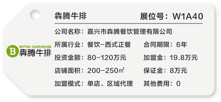 犇腾牛排于2008年在嘉兴开出第一家牛排餐厅,严选好食材追求好工艺,严把食品关,努力把健康美味的牛排带给大家分享,创始人庄今宝军人出身的基因让犇腾在发展的十年中一步一个脚印,从一而终,我们坚信一定可以呈现一份犇腾绿的好牛排。目前在华东、华中和华南共有70家餐厅,未来,我们依然坚信专注一块牛排,犇腾将创造出更多惊喜。