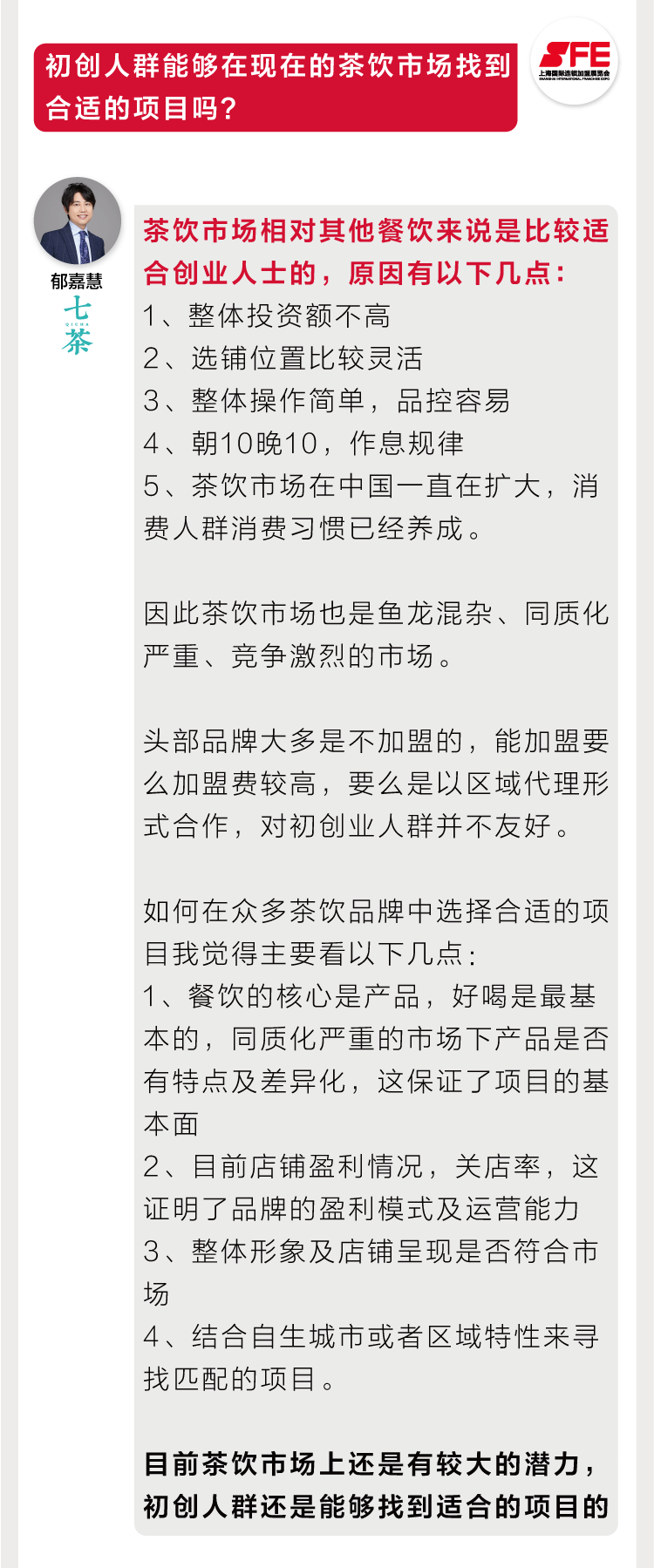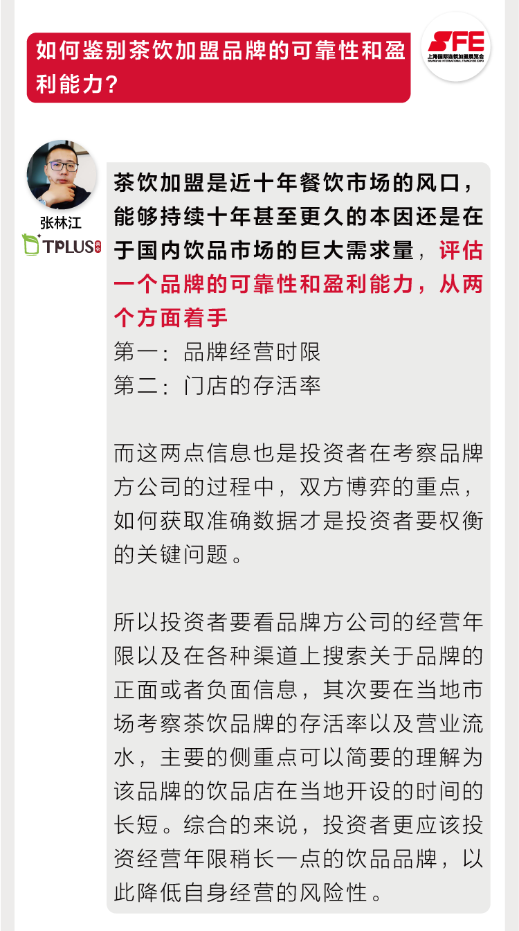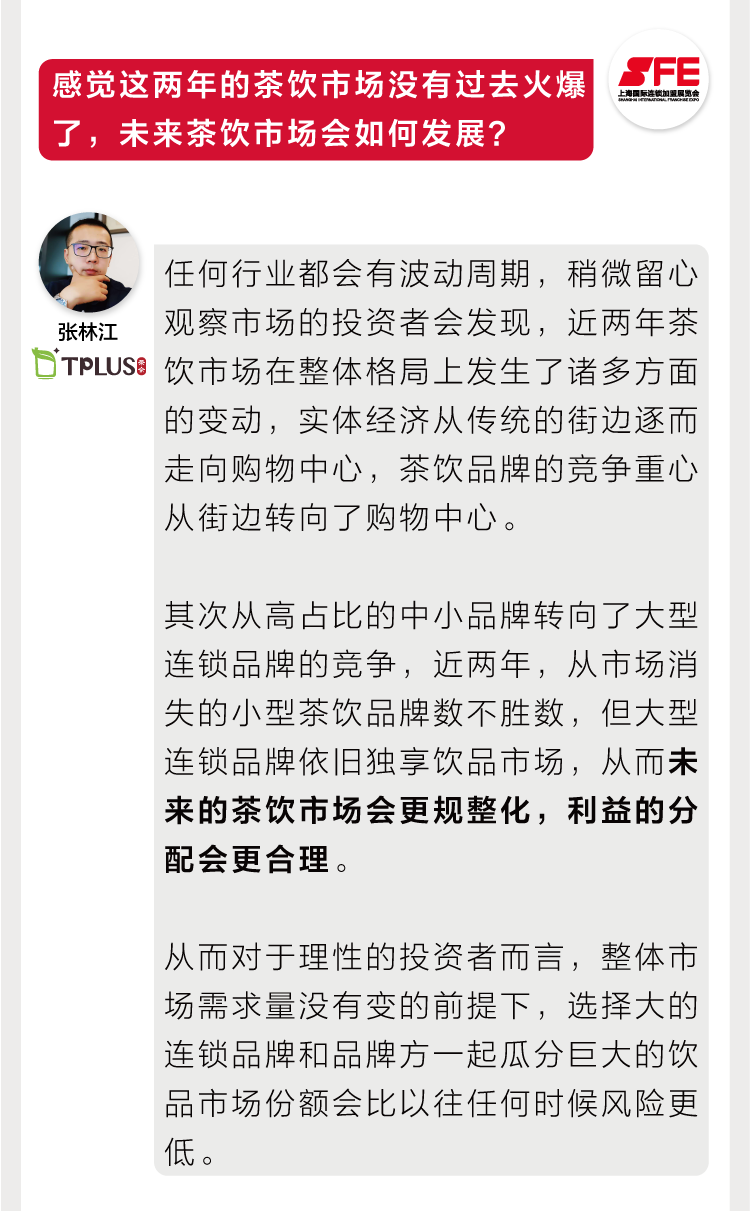 加盟茶饮到底能够赚到钱吗?对于这个问题,SFE总经理虞翔从多个角度进行了阐述:首先,茶饮市场多年来的快速增长有目共睹,有专业机构统计,目前国内各类茶饮门店超过70万家,年销售额超过2000亿元。在以连锁为主流的茶饮市场,这样的体量,不可能没有红利;其次,尽管喜茶、奈雪の茶等头部品牌以直营为主,不做加盟。但整个茶饮市场高度细分,各细分赛道都有连锁加盟标杆品牌存在,这些才是茶饮市场的主力,他们正在用自己的努力,不断推动行业往更加健康的方向发展,并且帮助更多的投资者享受茶饮市场不断增长的红利。再次,茶饮市场的红利令人垂涎,确实产生了不少加盟骗局。但这也从侧面证明了市场对投资者的吸引力。破坏远比建设容易。任何只讲问题不提供解决方案的言论,都是不负责任的。我们期待有更多的人,以更加专业的目光,来理性看待茶饮这个市场,一起推动它进入更好的时代。