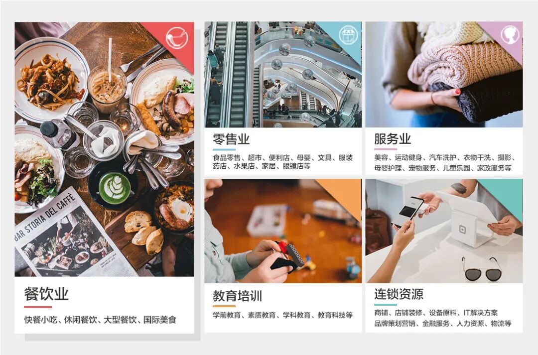 加盟在线按照快餐小吃、休闲餐饮、国际美食、大型餐饮、零售、服务、教育培训和连锁资源八大板块划分,涵盖超过120+主流细分业态,标杆品牌和实力新锐云集,市场热点和风向趋势一览无余。