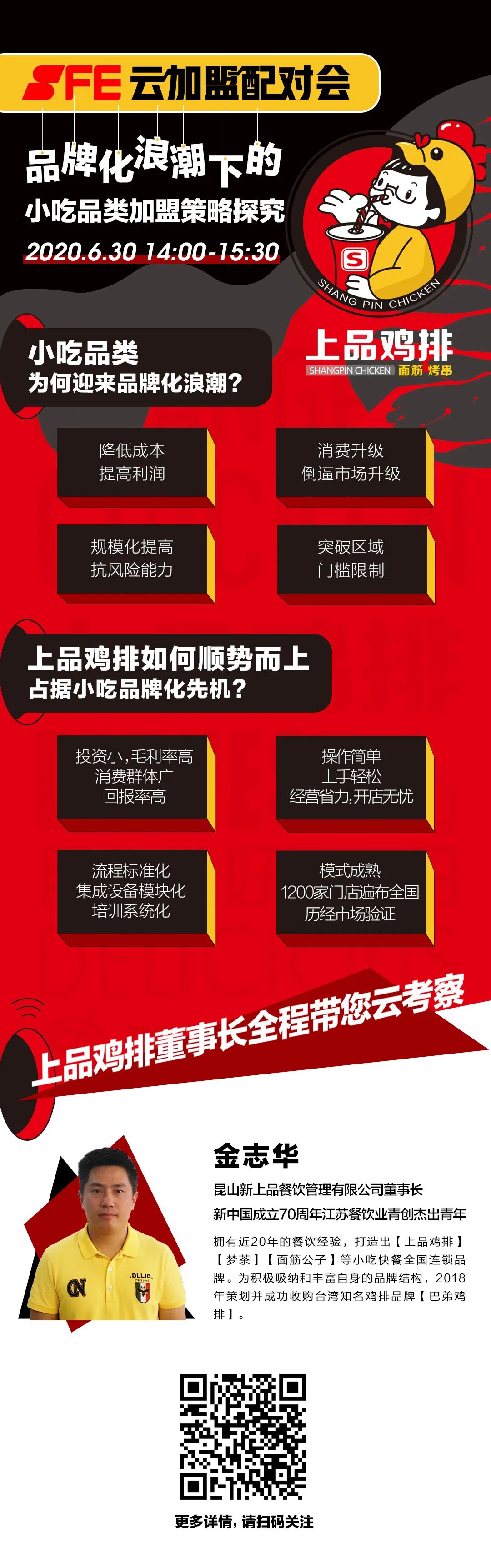 昆山新上品餐饮管理有限公司董事长金志华先生将亲临SFE云加盟配对会直播间,深度解读鸡排品类市场现状与趋势,提供加盟投资专业意见。同时还将带领大家,专业全面云考察上品鸡排的公司、供应链后端及产品门店等。并针对SFE直播间观众提供最具性价比商务加盟政策。