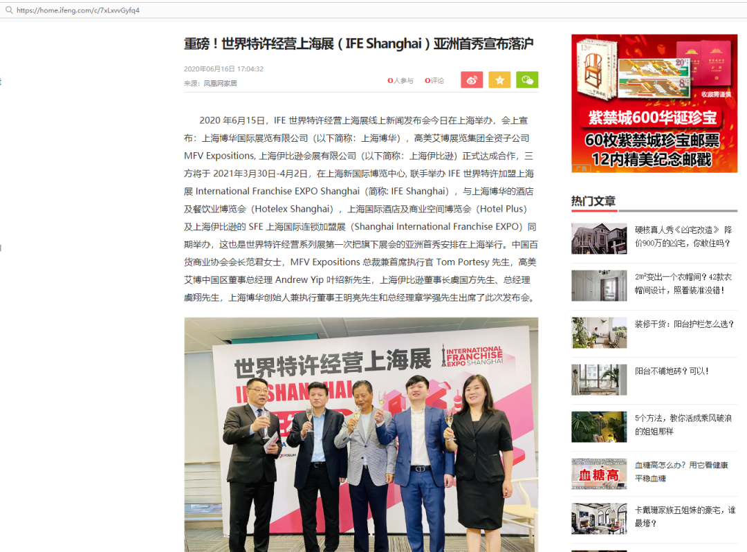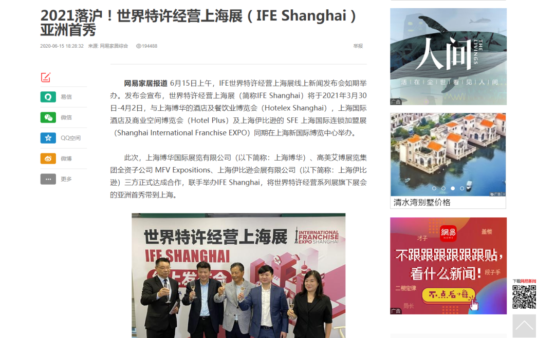 此次发布会得到业内和社会各界的广泛关注,吸引了包括SITV、中新社、东方财经、腾讯视频、凤凰网、网易、爱奇艺、优酷各大国内知名主流媒体争相报道。此外,凭借IFA在国际连锁特许经营业的优势地位,在如FACE BOOK 以及各大主流网站等国外媒体同样进行了大量曝光,进一步提升了IFE Shanghai的影响力。