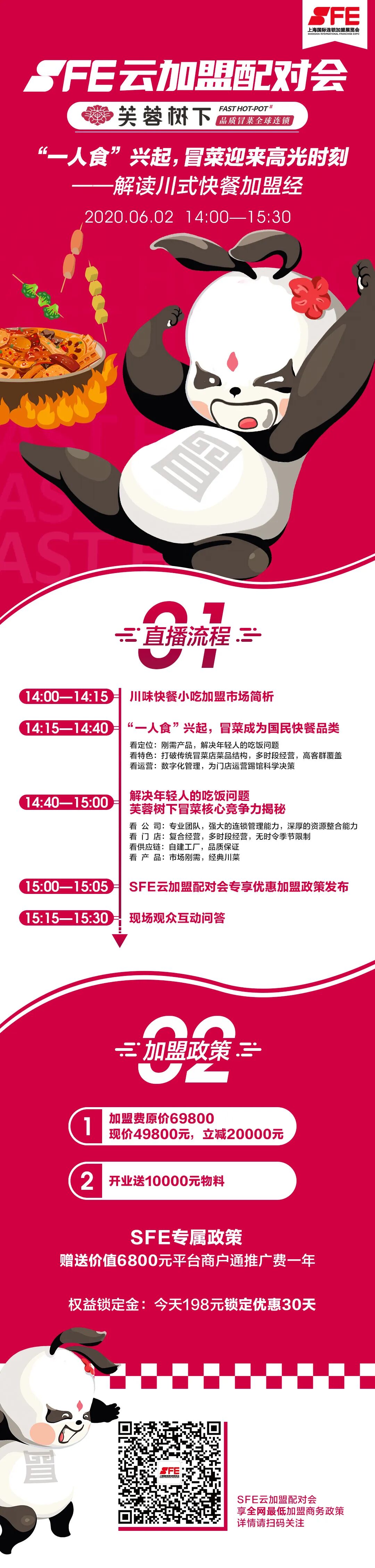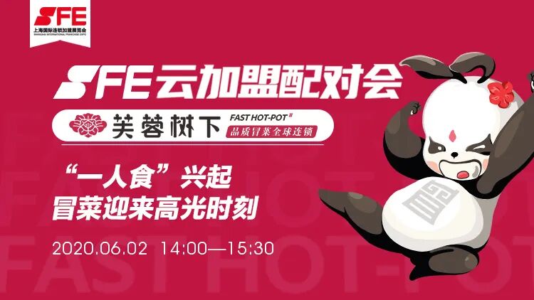 6月2日下午14:00到15:30分,SFE云加盟配对会第四场,SFE云加盟配对会——芙蓉树下专场,“一人食”兴起,冒菜迎来高光时刻。