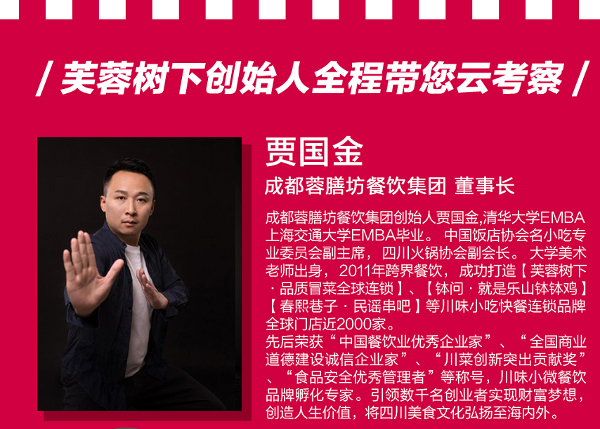 芙蓉树下创始人,成都蓉膳坊餐饮董事长,“四川火锅协会副会长”、“中国餐饮业优秀企业家”、“全国商业道德建设诚信企业家”贾国金先生做客SFE云加盟配对会直播间,解析芙蓉树下如何通过产品标准化,运营连锁化,快餐品牌化,通过冒菜这个刚需品类,解决年轻消费者的吃饭问题。