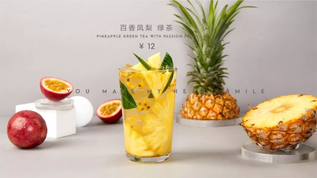 盐津去涩的凤梨是夏天的最爱,百香果的芳香物质能促进大脑多巴胺的生成,绿茶平衡了凤梨和百香果的酸甜度,茶香和果香相互融合,这种天气来一杯百香凤梨绿茶,叫醒整个夏天。