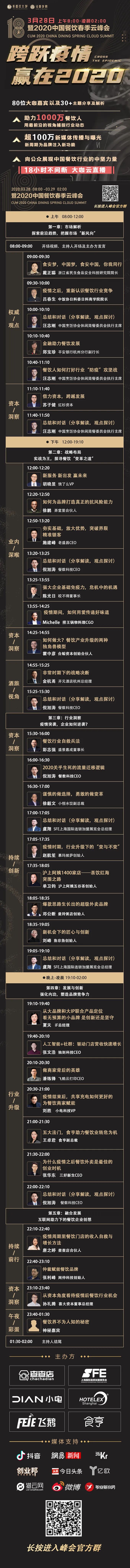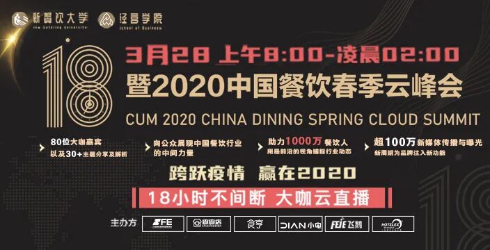 2020年3月28日08:00-次日02:00,由SFE上海国际连锁加盟展、HOTELEX、查查店、食亨、飞鹅云、小电联合主办,大咖云集的《跨越疫情,赢在2020——2020中国餐饮春季云峰会》线上大直播正式开启!从早上8点持续至凌晨2点,连续18个小时不断播,为你讲透疫情重压下的餐饮生意!