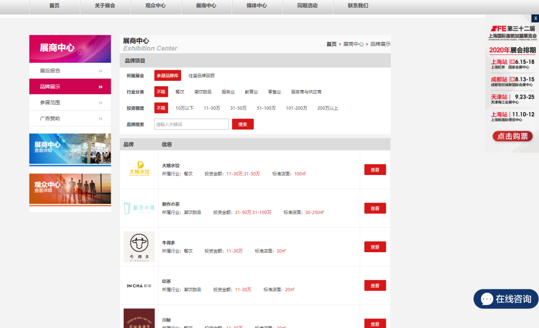 观众可以从品牌专题页 查看所有展示品牌的关键信息,包括品牌介绍所属业态、开放加盟区域、加盟模式、门店要求、投资金额、加盟金、保证金及合同期限等。此外,您还可在品牌专题页面下通过添加 SFE专属客服 进行线上咨询。