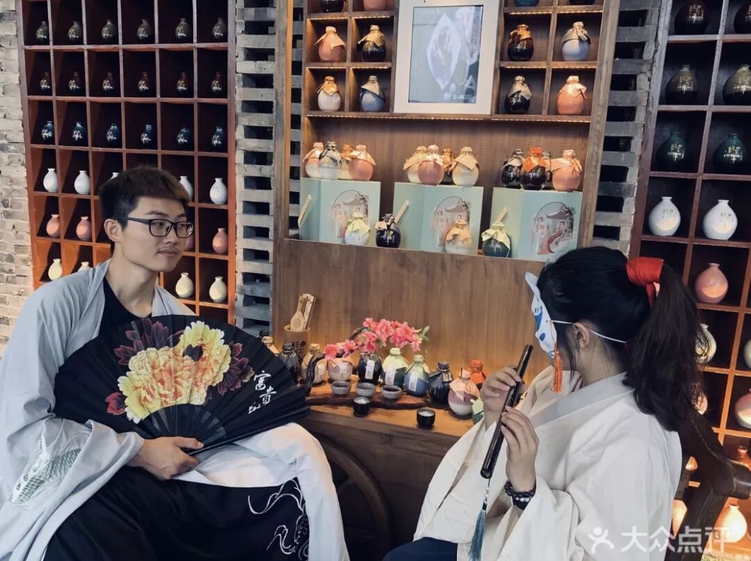 5个系列,14款酿酒,听祝酒琴,行酒筹令,用壶装酒,能吃到40多道中式地方菜,像在古代酒吧里喝酒,有侠骨,有柔情。