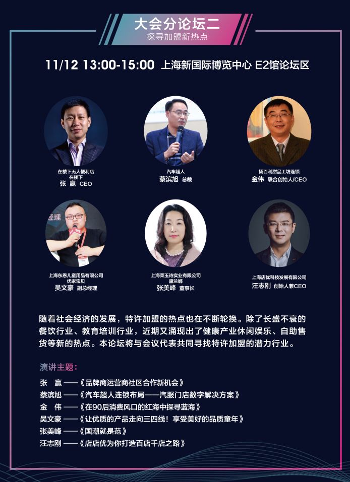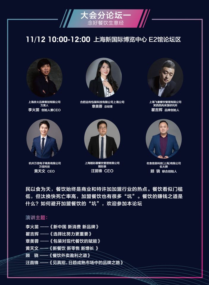 11月12日至13日,展会邀请戎嬷嬷燕窝、猛男的炒饭、鲍江南、和番丼饭、RELX悦刻、南翔小笼、吉品合、麻辣书生、型男美蛙、蜀游记、鑫栗王、翘彩唇、杭州餐数科技等13家品牌的高管在SFE加盟公开课现场现场为投资人赋能: 让大家在全流程深度考察品牌的同时,能够从更宏观的角度了解行业变革,从微观角度学习店面运营引流等实操技术,让自己有所学,有所得。