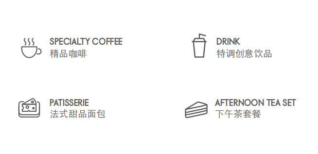 精选健康美颜食材,以精致法式方式做创意呈现精品咖啡,咖啡豆选取Heirloom原生种产自埃塞俄比亚耶加雪菲 特调创意饮品结合季节及活动,推出联名限定款 每月结合国际流行趋势,定期推出手作法式甜品用法餐的仪式感呈现三道式特色下午茶套餐。