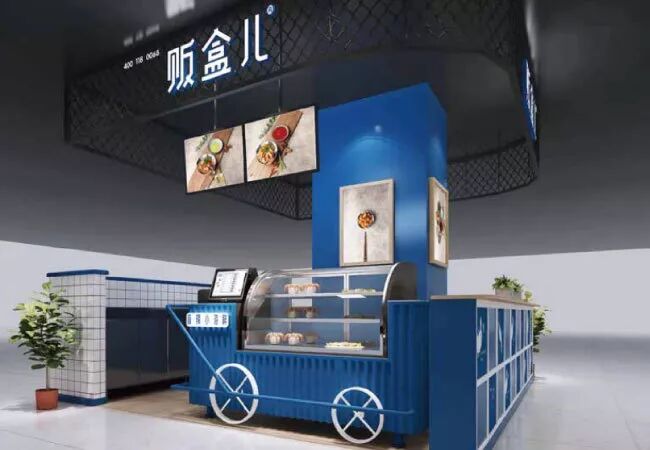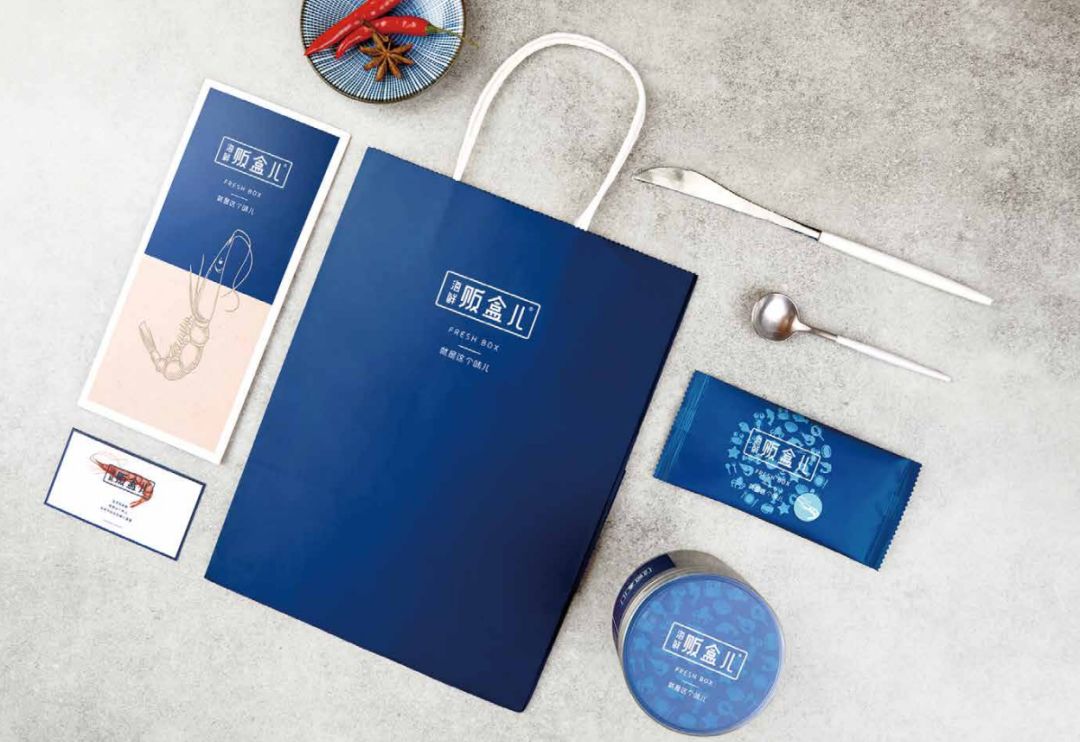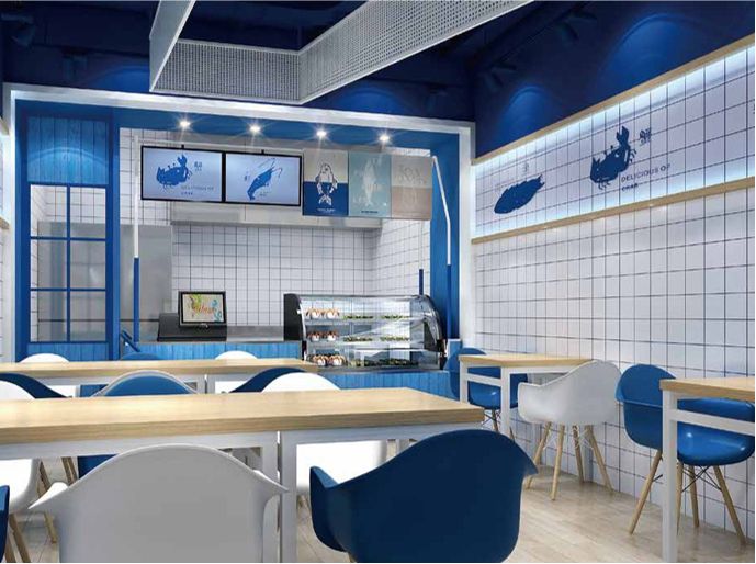 海鲜贩盒儿整体门店色调以蓝白色为主
