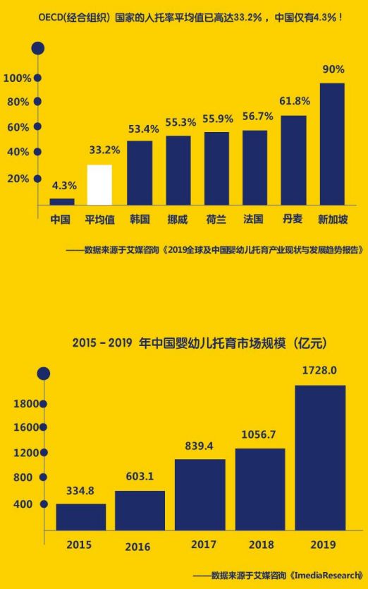 全国0-3 岁婴幼儿在各类托育机构的入托率仅为 4.3%,即便在城市,3岁以下婴幼儿的入托率也不 到10% , 发达国家3 岁以下婴幼儿的入托率在 25%~55%,法国的入托率达到56.7%,新加坡达90%,2019年中国托育市场规模突破1700亿。