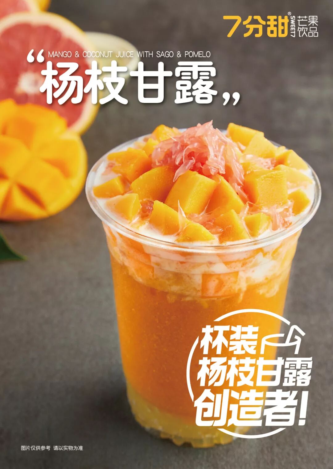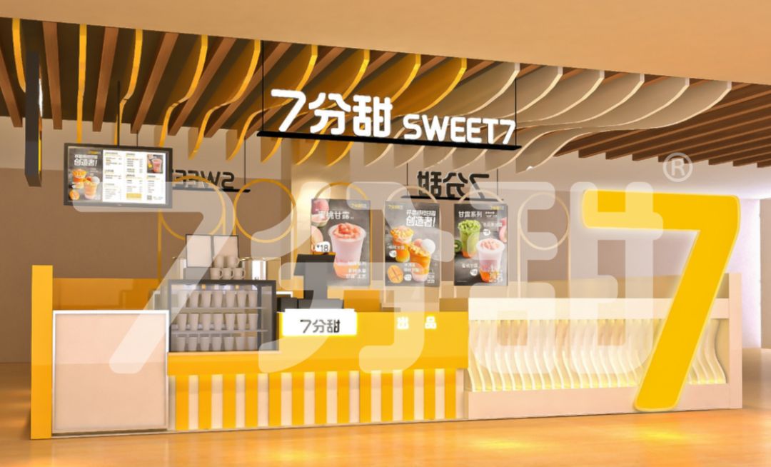 7分甜的超级符号——巨大的阿拉伯数字7的立型渲染,加上通体的芒果黄主色调,成为茶饮市场一道靓丽的风景线。
