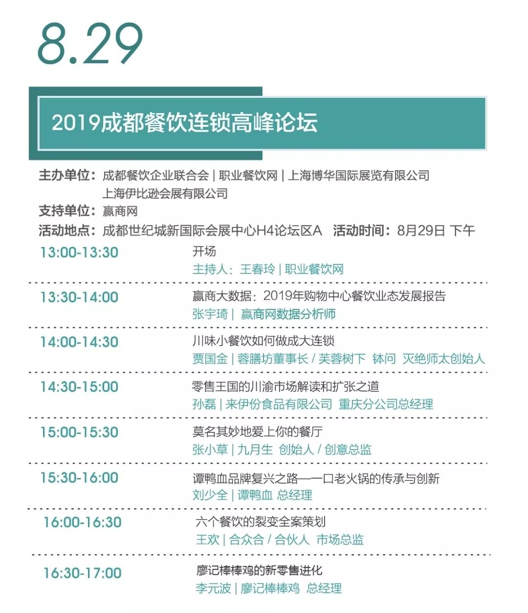 成都餐饮连锁高峰论坛,将在8月29日下午于成都世纪城新国际会展中心H4论坛区A举行。论坛落脚“实”处,既有行业领先服务商代表带来的《赢商大数据:2019年购物中心餐饮业态发展报告》,又有业内多家标杆品牌代表人物围绕赋能连锁品牌创新、把握连锁经营热点与启示,现场解读前沿思想、专业观点乃至实操战术,在智慧的碰撞中,共塑连锁加盟行业的未来。