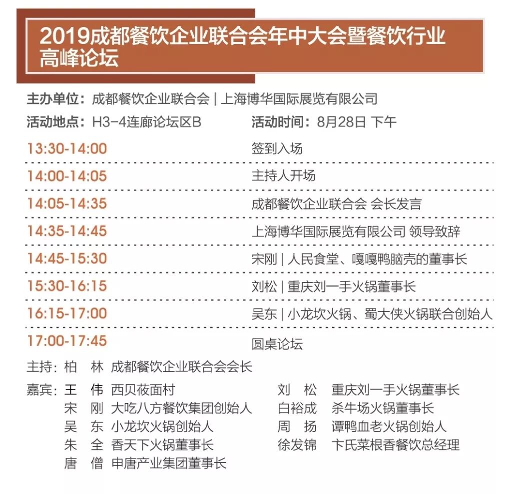 成都餐饮行业高峰论坛暨2019成都餐饮企业联合会年中大会将在8月28日下午于成都世纪城新会展中心H3-4连廊论坛区B举行。