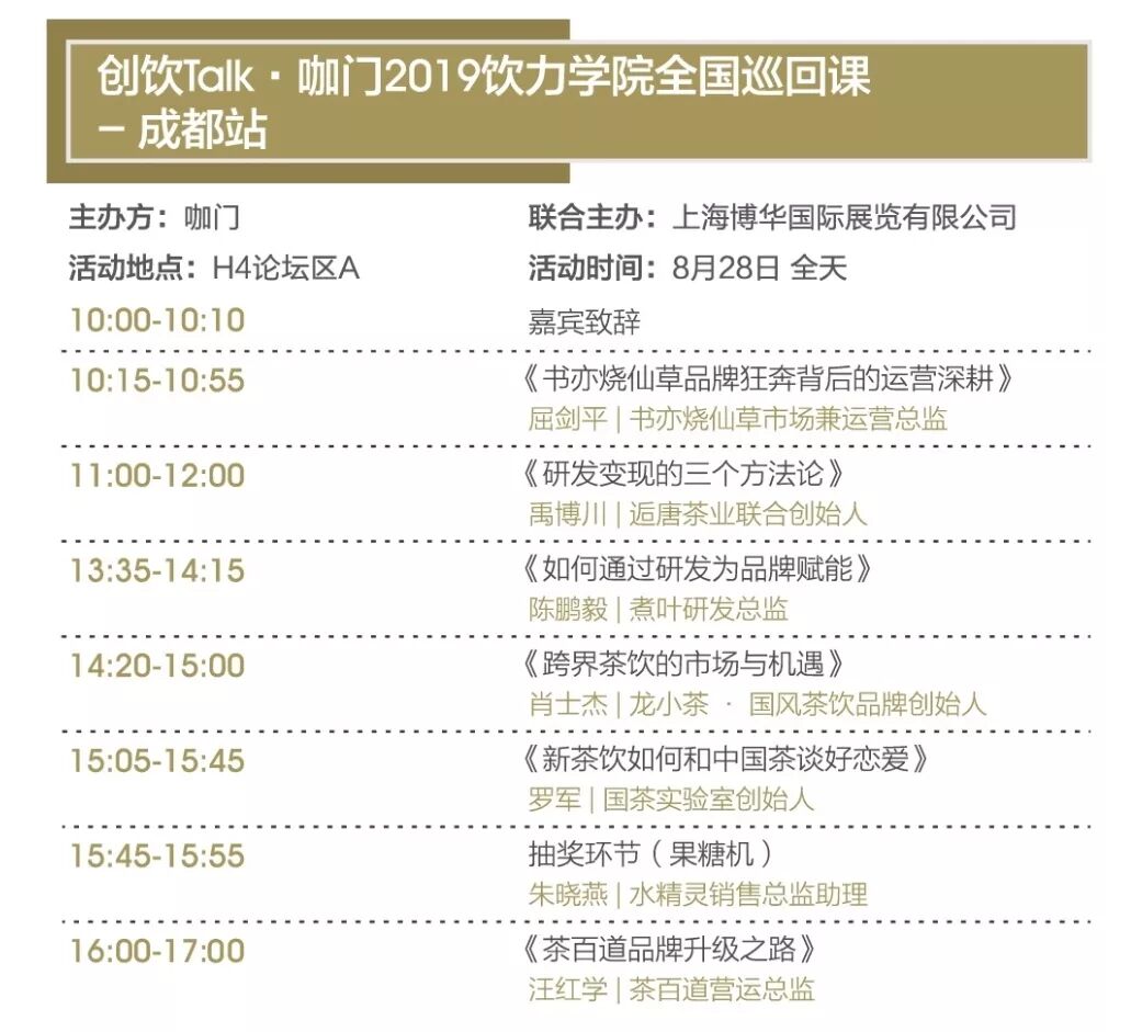 创饮Talk饮力学院全国巡回课将在8月28日早上9点举行,邀请了饮品行业领袖和成功典范,围绕产品和运营开展,产品承载品牌使命,从研发技巧到爆款逻辑,从人员培训到加盟管理,从话题交流到模式思考,共同塑造饮品行业未来。