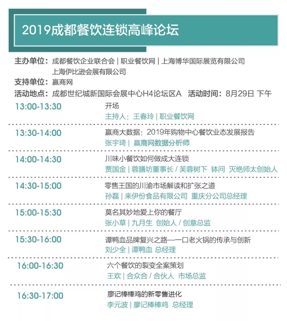 成都餐饮连锁高峰论坛,将在8月29日下午于成都世纪城新国际会展中心H4馆论坛区A举行。既有行业领先服务商代表带来的《赢商大数据:2019年购物中心餐饮业态发展报告》,又有业内多家标杆品牌代表人物围绕赋能连锁品牌创新、把握连锁经营热点与启示,现场解读前沿思想、专业观点乃至实操战术,在智慧的碰撞中,共塑连锁加盟行业的未来。