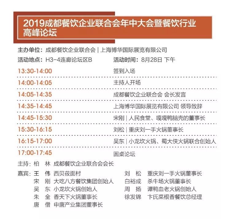 将在8月29日下午于成都世纪城新国际会展中心H4论坛区A举行,邀请了谭鸭血、廖记棒棒鸡、芙蓉树下、来伊份等国内知名餐饮及互联网等业界大咖,他们将带来对餐饮企业的全方面案例分析、网红店成功运营经验分享以及行业专家的总结分享。暨2019成都餐饮企业联合会年中大会将在8月28日下午于成都世纪城新会展中心H3-4连廊论坛区B举行。