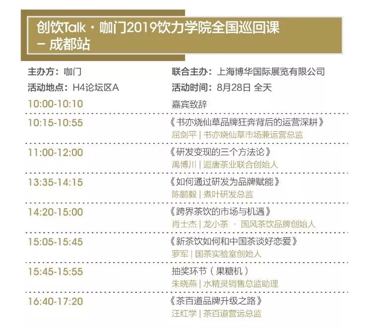 将在8月28日早上9点举行,邀请了饮品行业领袖和成功典范,围绕产品和运营开展,产品承载品牌使命,从研发技巧到爆款逻辑,从人员培训到加盟管理,从话题交流到模式思考,共同塑造饮品行业未来。