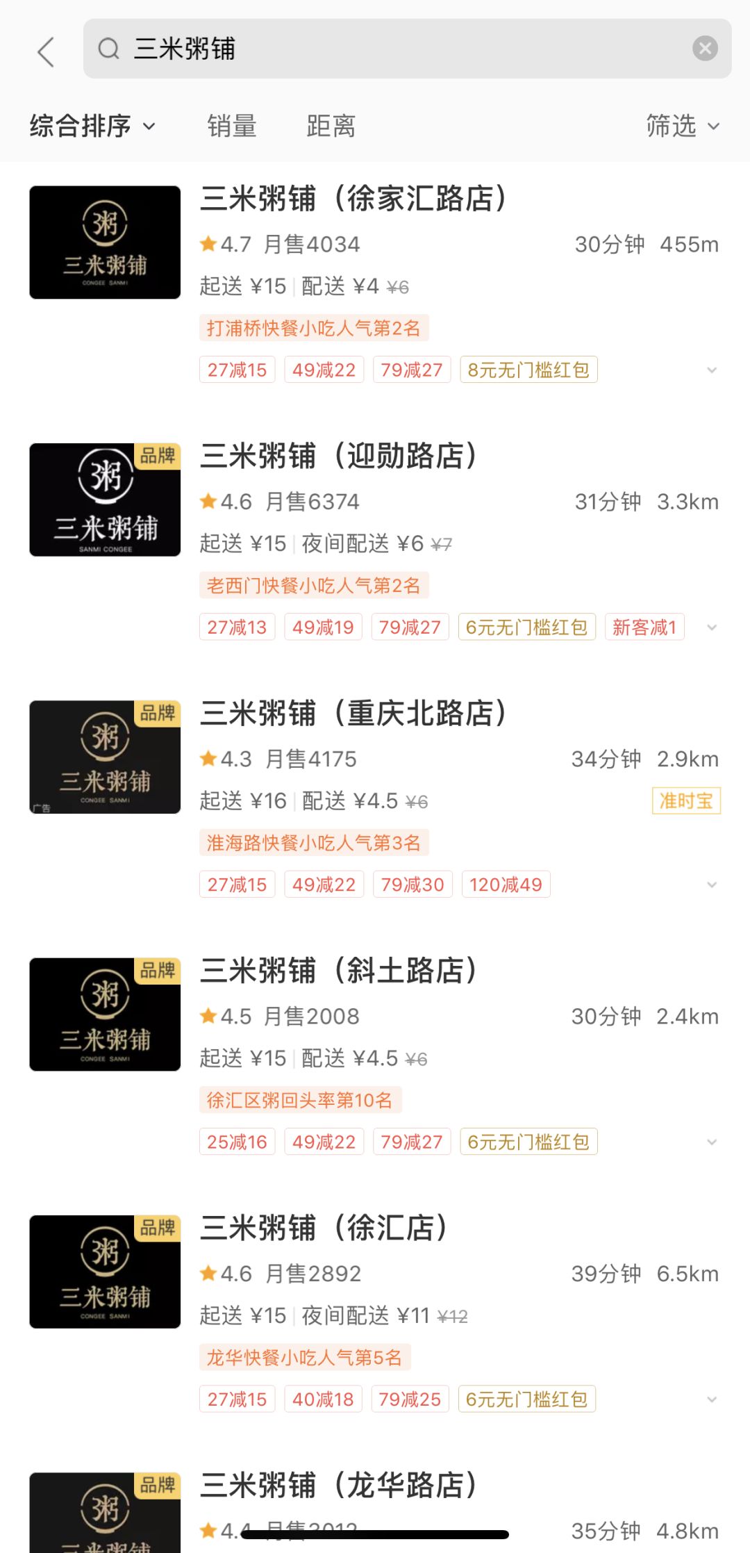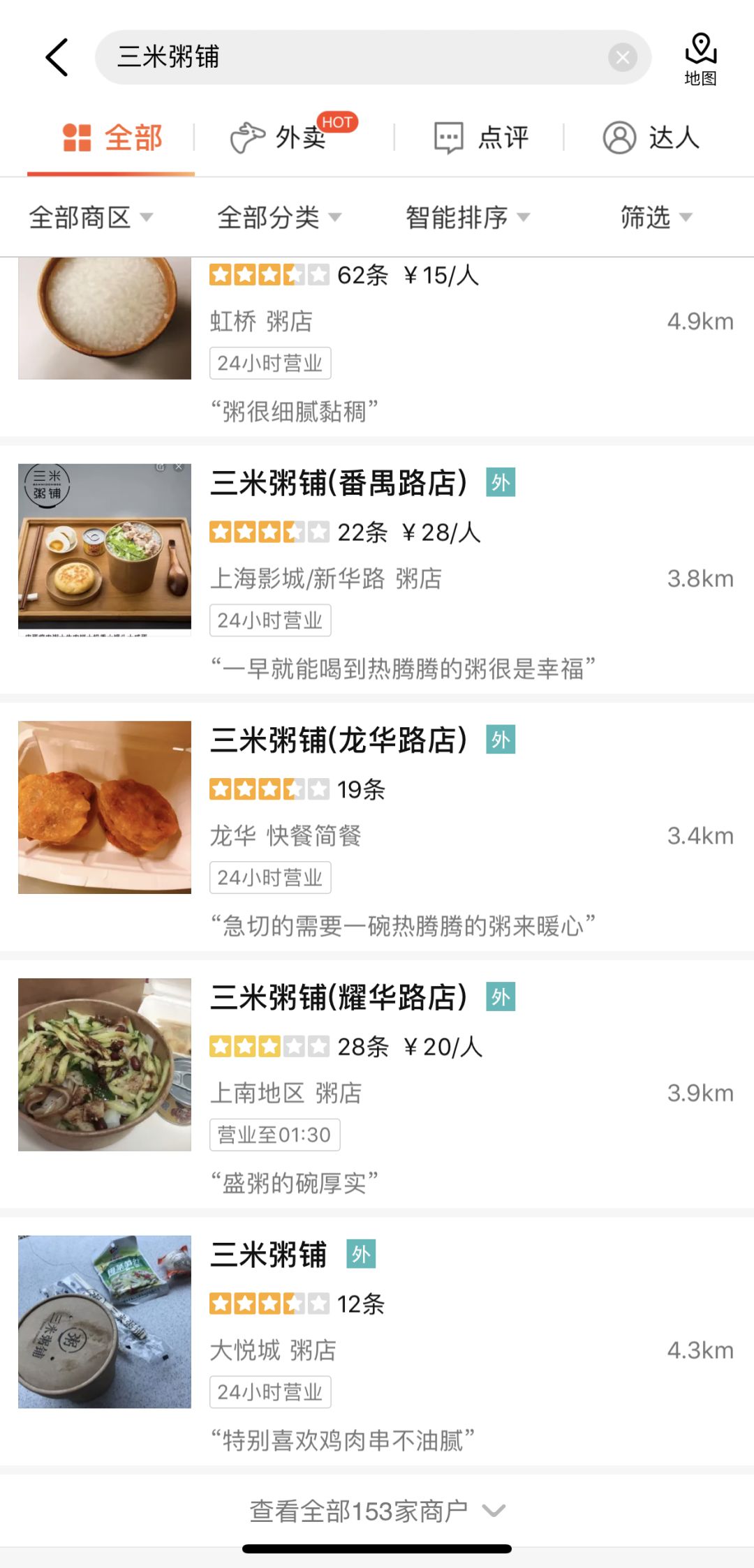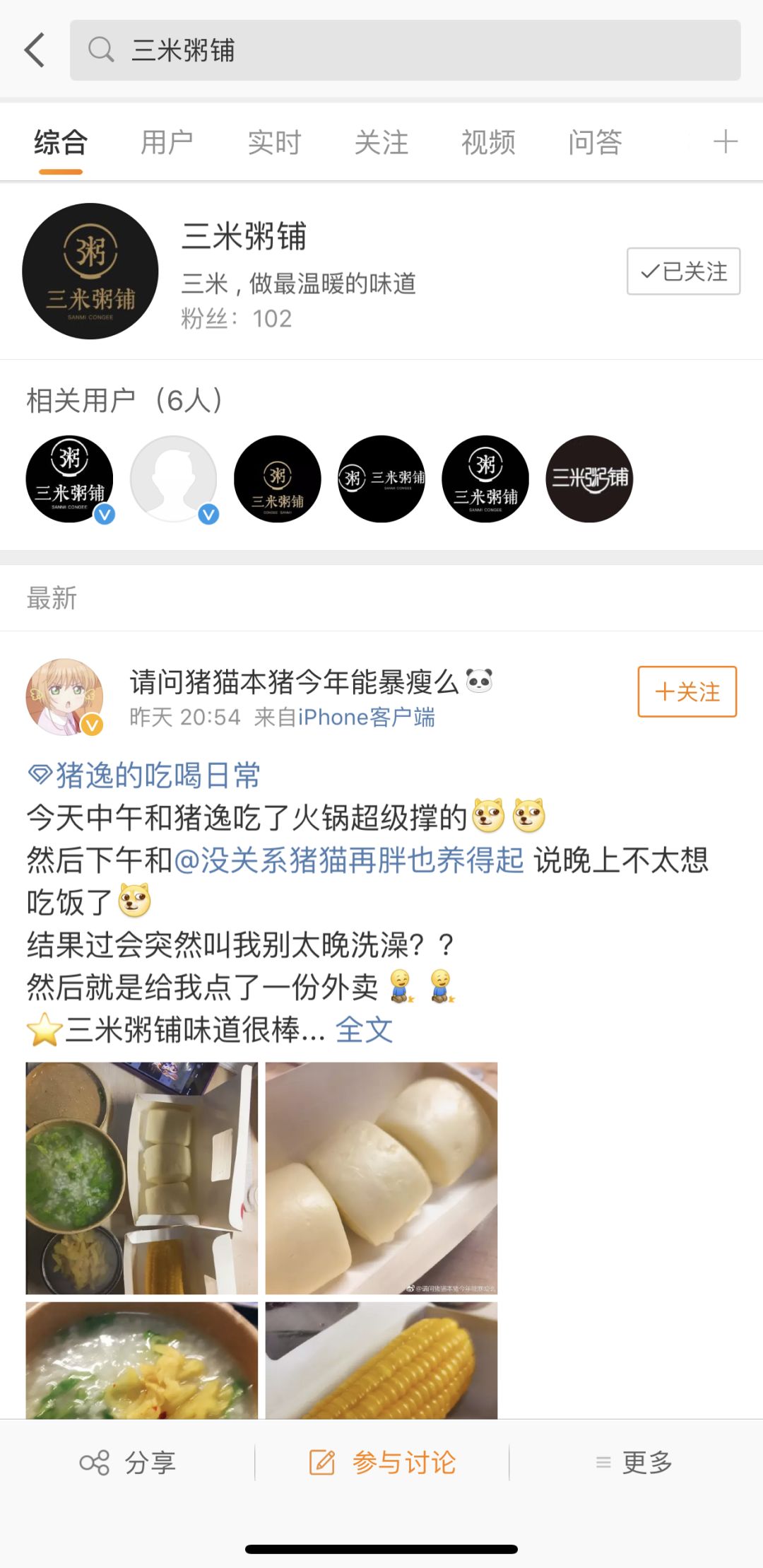 图为三米粥铺的大众点评、美团外卖、微博的搜索情况截屏,考察时尤其需要多看看评论区。